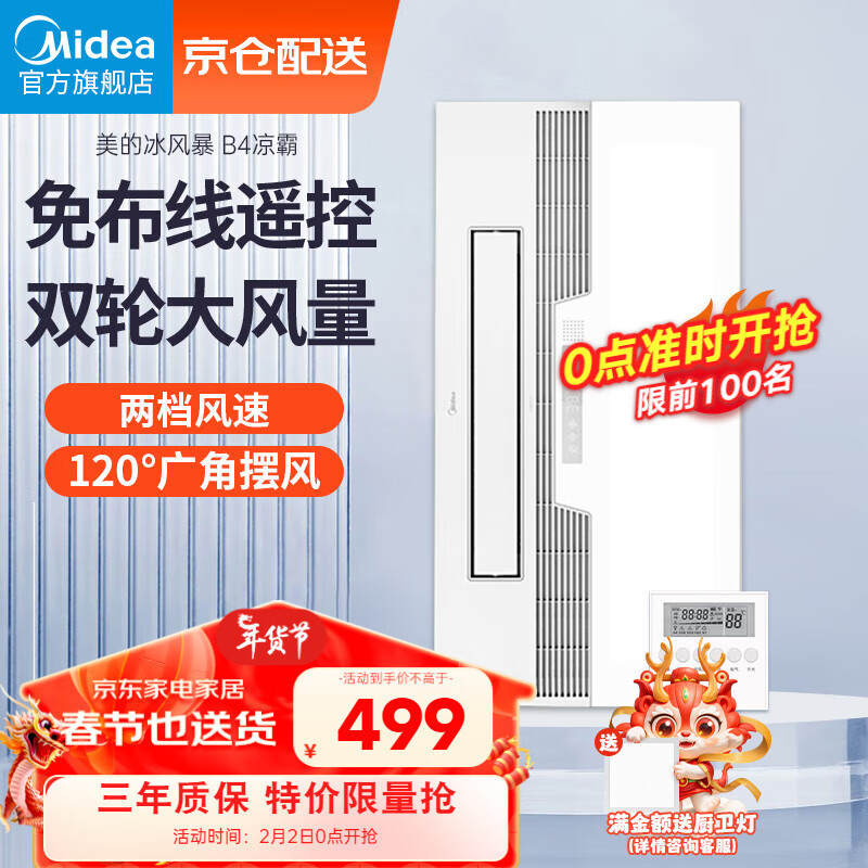 美的(Midea)凉霸厨房卫生间集成吊顶照明一体冷霸冷风机遥控摆风排气换气吹风价格:499.00元!