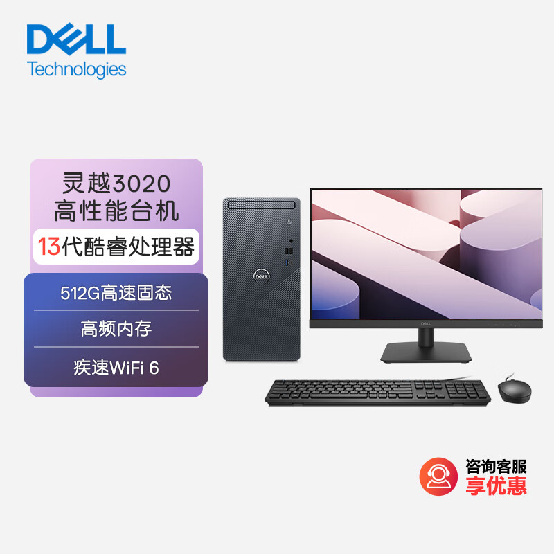 戴尔(Dell)灵越3020 台式电脑主机 (酷睿13代i3-13100 8G 512GSSD)23.8英寸大屏显示器 高性能CPU价格:3699.00元!
