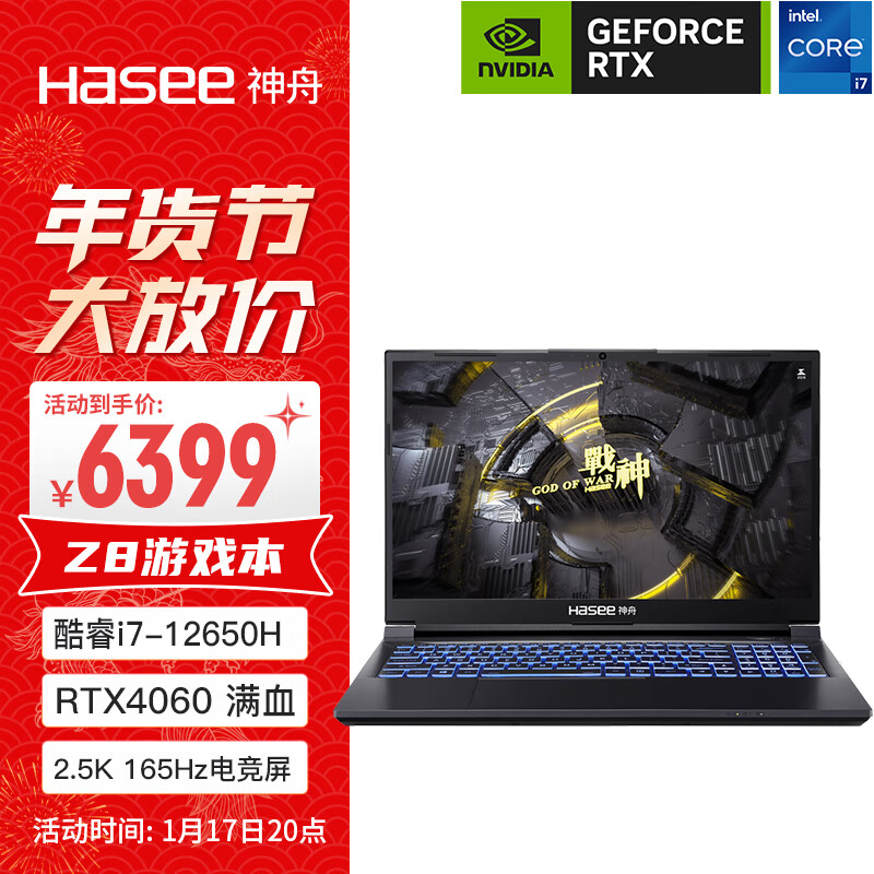 神舟(HASEE)战神Z8D6 12代英特尔酷睿i7 15.6英寸笔记本电脑(12代i7-12650H RTX4060 165Hz 2.5K电竞屏)价格:6399.00元!