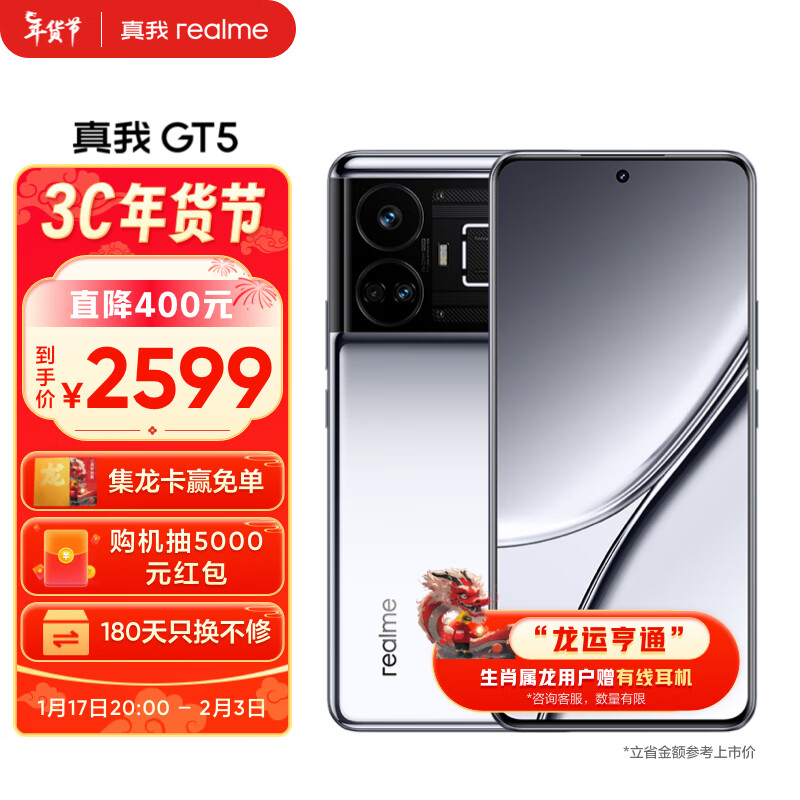 realme真我GT5 第二代骁龙8 5G旗舰芯 150W光速秒充 144Hz电竞直屏 12GB+256GB 流银幻镜 5G手机价格:2599.00元!