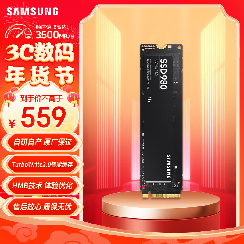 三星(SAMSUNG)1TB SSD固态硬盘 M.2接口(NVMe协议) 980(MZ-V8V1T0BW)价格:559.00元!