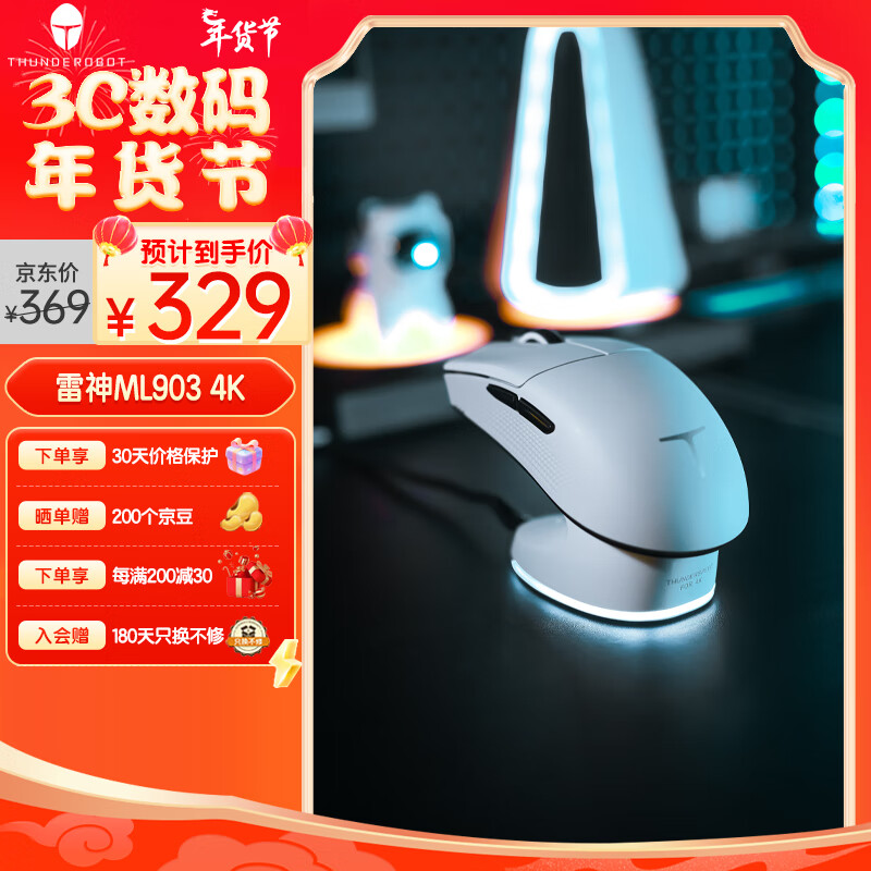 雷神(ThundeRobot)ML903 三模无线鼠标 蓝牙2.4G轻量化电竞办公游戏鼠标PAW3395含4k接收器充电底座 白色价格:359.00元!