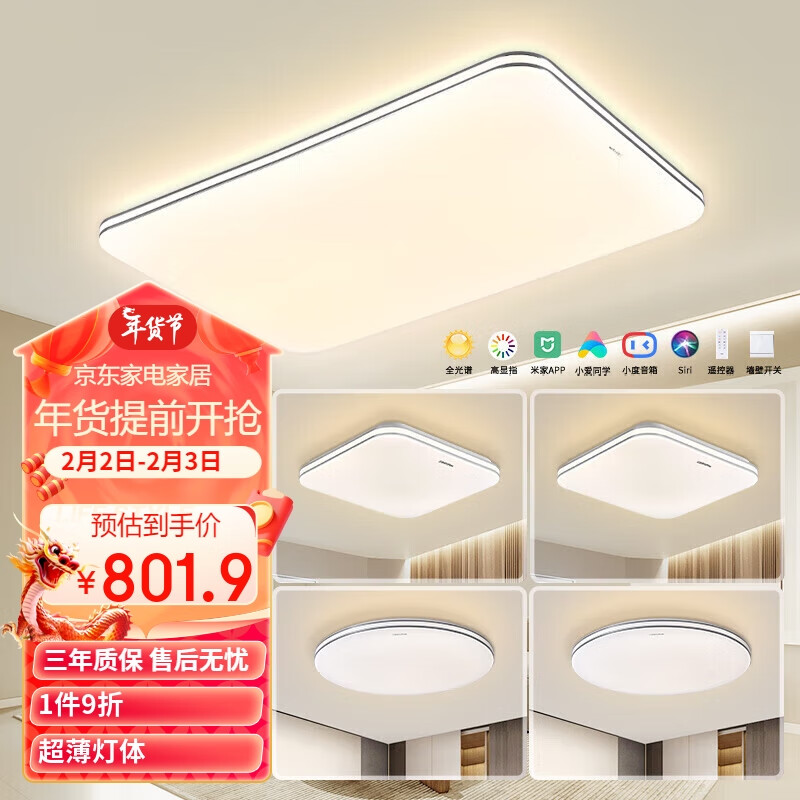 三雄极光 AI语音智能客厅灯led吸顶灯卧室灯 四室一厅5灯套餐现代简约灯具价格:891.00元!