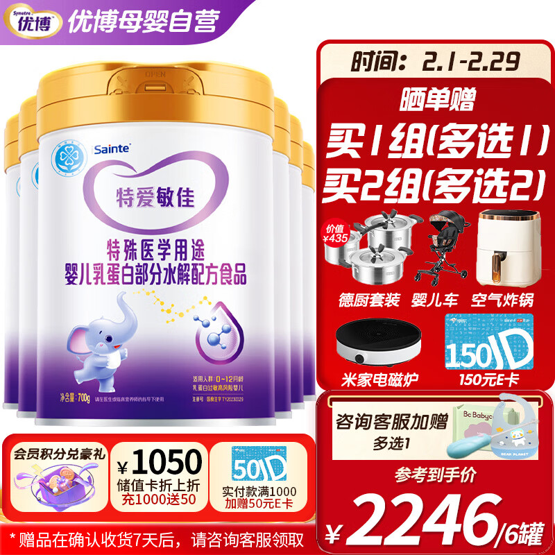 圣桐特爱优博敏佳婴幼儿乳蛋白部分水解特殊医学用途配方粉圣元缓解牛奶过敏降低致敏性全乳清蛋白700g*6罐装价格:2246.00元!