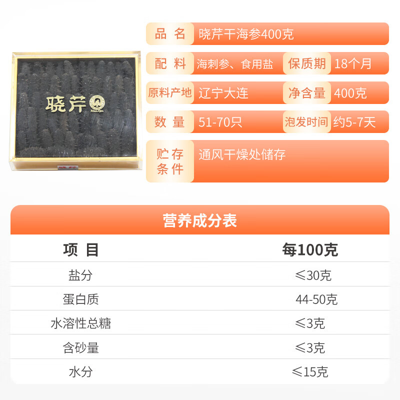 晓芹 大连干海参 400g51-70只 辽刺参 海参干货价格:4090.00元!
