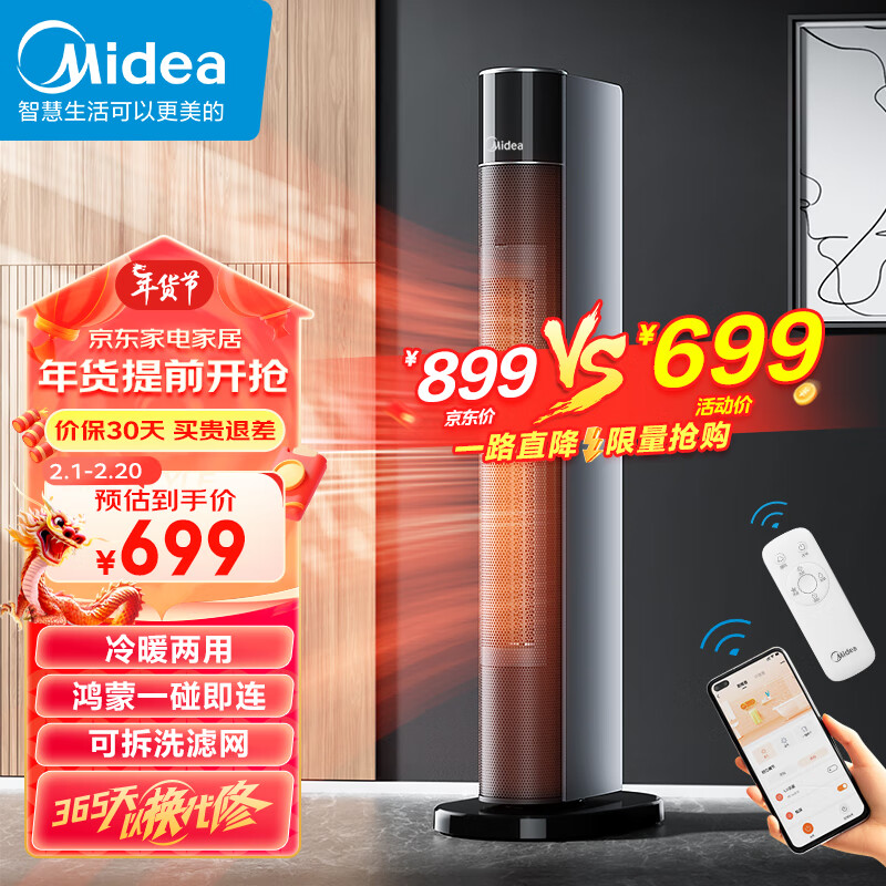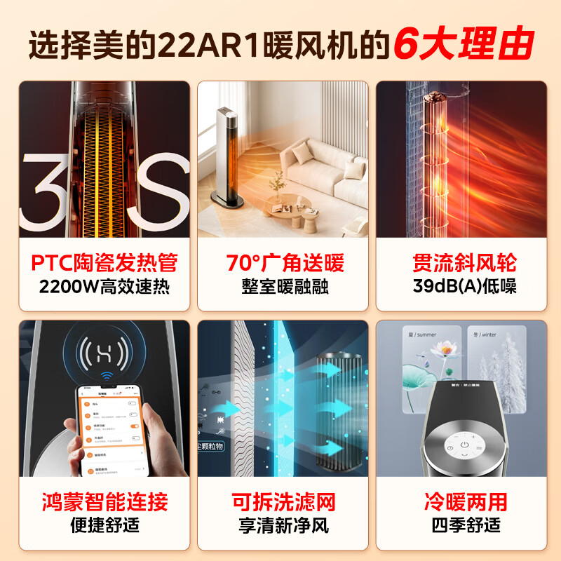 美的(Midea)【品质臻选】电热取暖器/冷暖风机/电暖器/电暖气家用/WiFi鸿蒙智联/摇头电热电暖风扇HFX22AR1价格:1221.00元!
