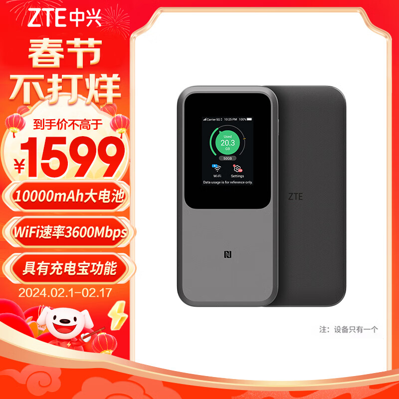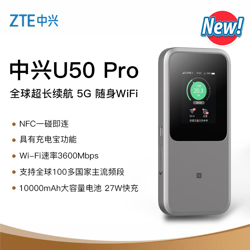 中兴(ZTE) 5G随身WiFi6/10000毫安移动插卡路由器cpe/载波聚合/NFC直连/MU5120/U50 Pro价格:1749.00元!