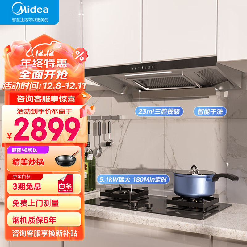 美的顶吸欧式抽油烟机 23大吸力家用厨房油烟机三腔自动清洗 定时烟灶套装 TQ307+Q318P(天然气)价格:2899.00元!