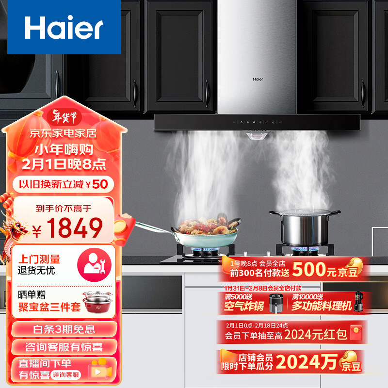 海尔(Haier)抽油烟机 烟灶套装 21m3/min大吸力 挥手智控自旋洗 欧式家用吸油烟机燃气灶 T11+Q2BE2(天)价格:1849.00元!