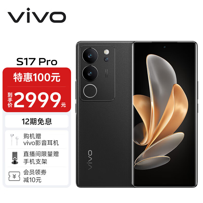 vivo S17 Pro 12GB+512GB 玄黑 前置5000万广角柔光 专业长焦人像镜头 天玑8200旗舰芯片 5G 快充 拍照 手机价格:3099.00元!