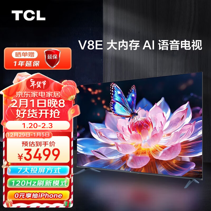 TCL电视 75V8E 75英寸 4K超清 支持120Hz防抖 130%色域智能超薄屏 液晶平板电视机[厂家直发]价格:3499.00元!