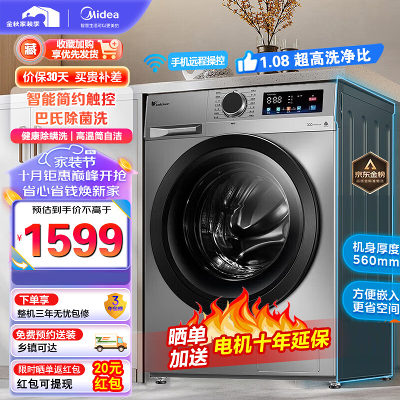 小天鹅(LittleSwan)10公斤洗衣机全自动滚筒 大容量彩屏显示1.08洗净比除螨除菌 【096-Y1T升级款】26DY价格:1599.00元!