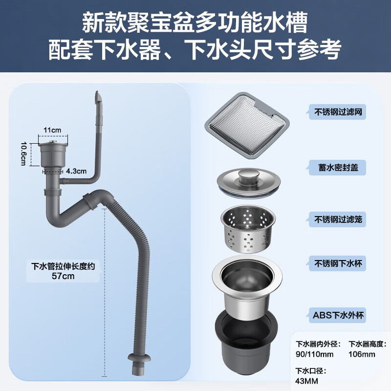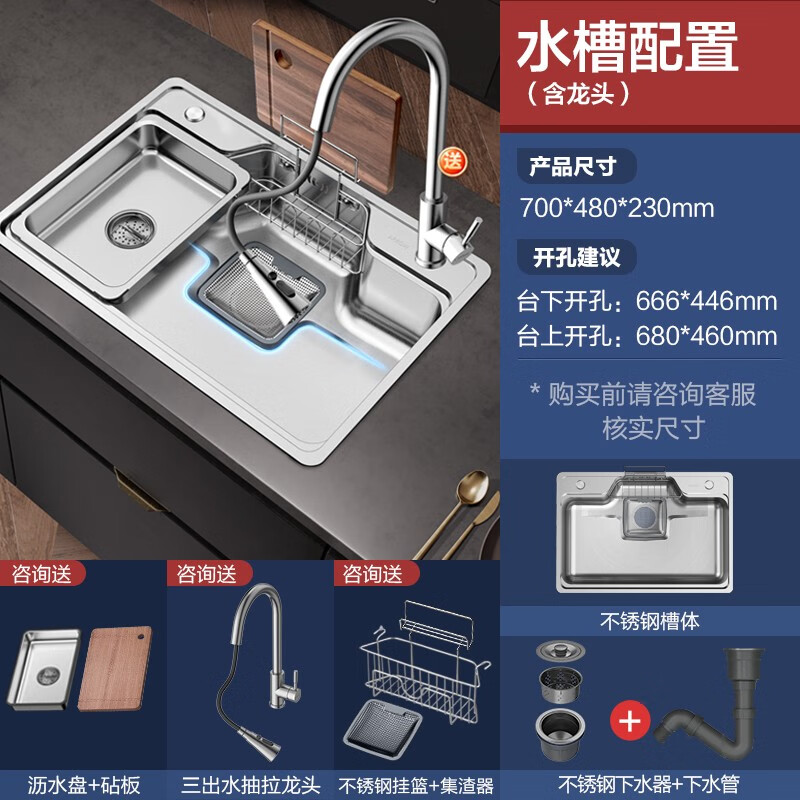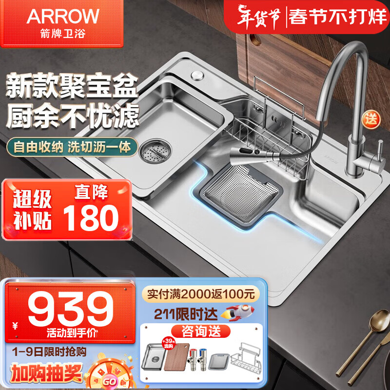 箭牌(ARROW)304不锈钢水槽 日式大口径单槽厨房洗菜盆台上盆大单槽 70*48聚宝盆单槽+冷热抽拉龙头价格:939.00元!