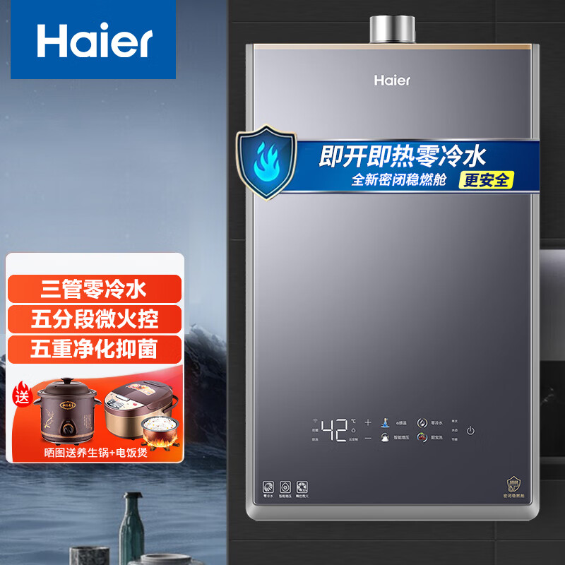 海尔(Haier)三管零冷水燃气热水器16升家用双增压大水量变频恒温密闭稳燃舱自检天然气WiFi智控价格:2879.00元!