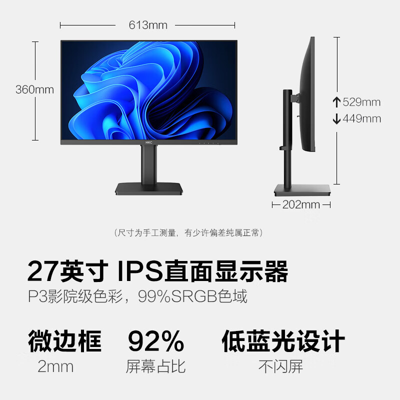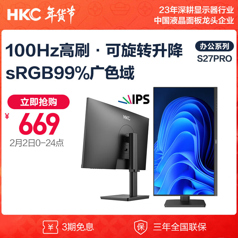 HKC 27英寸 IPS屏幕 100Hz显示器 爱眼滤蓝光不闪屏 高清广色域 旋转升降办公家用电脑显示屏 S27Pro价格:799.00元!