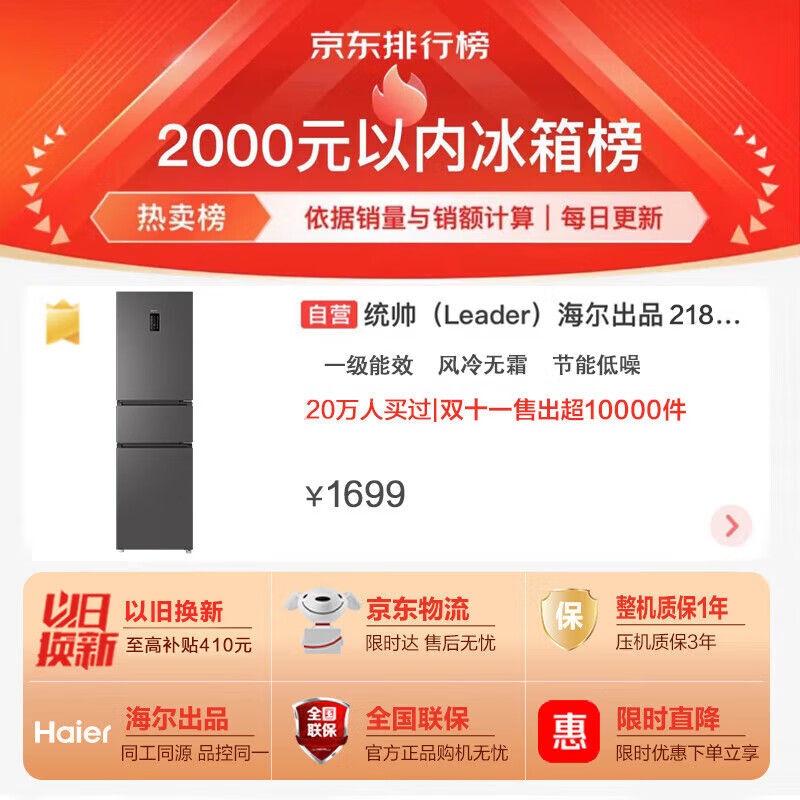 Leader 海尔智家出品218升一级能效风冷无霜三门变温净味小户型家用超薄电冰箱 BCD-218WGLC3D7S9U1价格:1499.00元!
