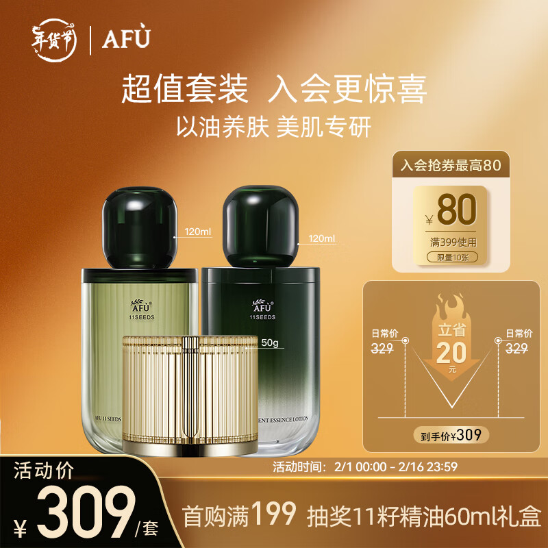 阿芙(AFU)十一11籽淡纹护肤套装水120ml水替120ml乳120ml霜50g 送女友礼物价格:399.00元!