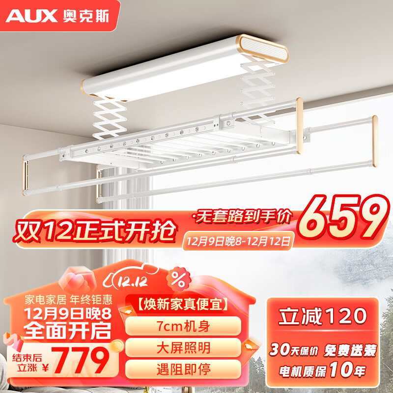 奥克斯(AUX)电动晾衣架升级款自动升降杆阳台室外四杆伸缩无线遥控LED照明白价格:739.00元!