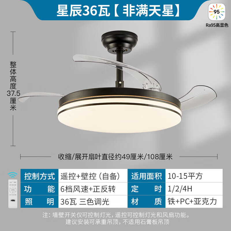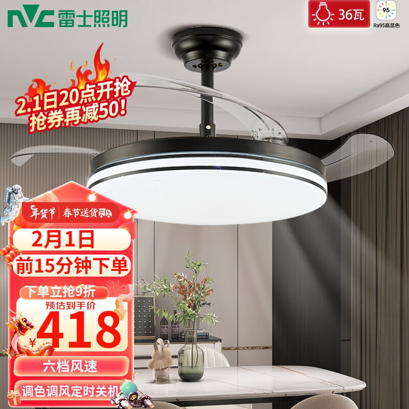 雷士(NVC)风扇灯吊扇灯餐厅卧室现代简约高显指变频黑色42寸36瓦价格:519.00元!