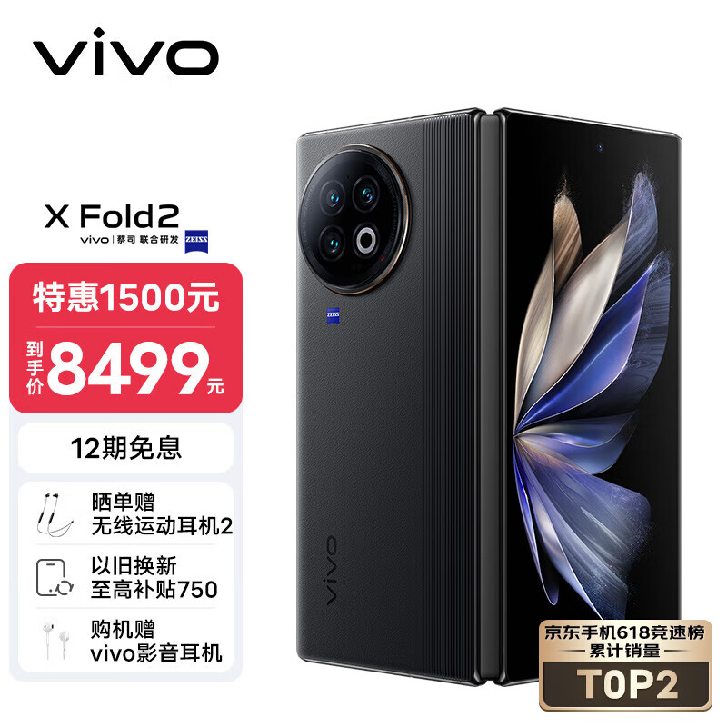 vivo X Fold2 12GB+512GB 弦影黑 2K+ E6 120Hz折叠巨幕 120W双芯闪充 第二代骁龙8 5G 折叠屏手机 xfold2价格:8499.00元!