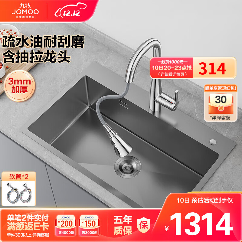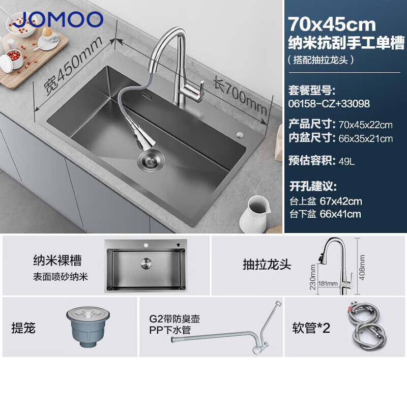 九牧(JOMOO)不锈钢手工水槽厨房洗菜盆单槽洗碗池70*45(含龙头)02264-00-Z价格:1414.00元!