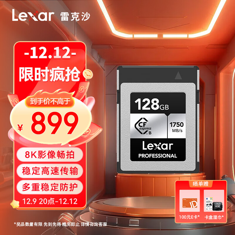 雷克沙(Lexar)128GB CFexpress Type B存储卡 SILVER系列 读1750MB/s 写1300MB/s 8K高清影像卡价格:899.00元!