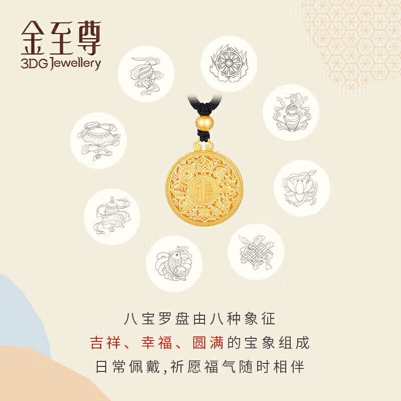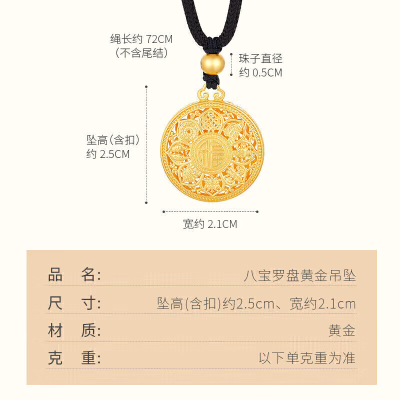 金黄金吊坠八宝罗盘大版古法999足金挂坠配黑绳项链计价 6.89克价格:4665.00元!