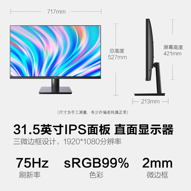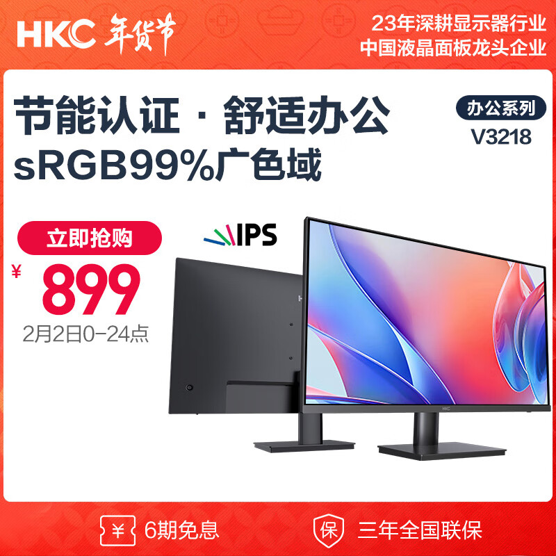 HKC 31.5英寸 IPS屏幕 滤蓝光不闪屏 广色域 三面微边可壁挂 节能认证 商务办公台式电脑显示器 V3218价格:999.00元!