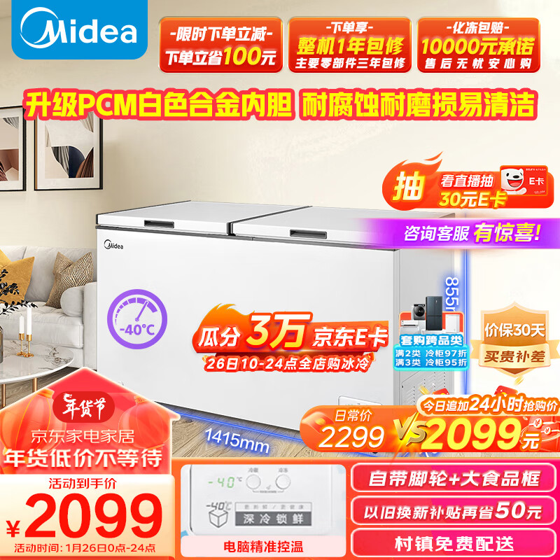 美的(Midea)423升 大容量商用家用冰柜 五面制冷囤货大冷柜 电子控温冷藏冷冻转换卧式冰箱 BD/BC-423DKEM(E)价格:2199.00元!