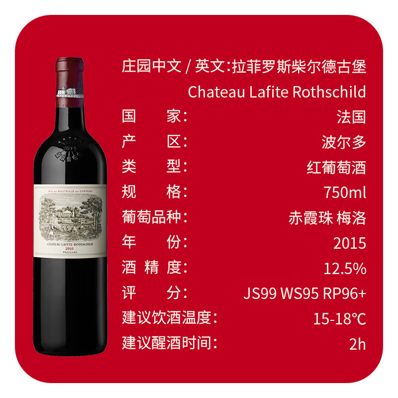 拉菲(LAFITE)拉菲罗斯柴尔德古堡 大拉菲 2015年份 1855一级庄 法国进口价格:9688.00元!