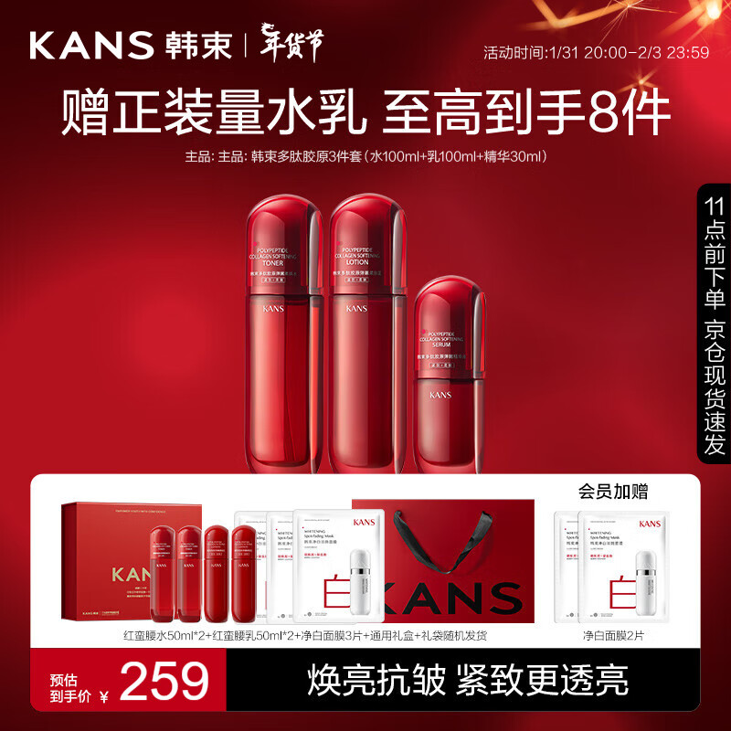韩束红蛮腰多肽胶原水乳精华3件套 抗氧抗糖护肤品套装新年礼物送女友价格:259.00元!