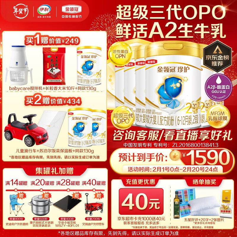 伊利金领冠 珍护 较大婴儿配方奶粉 2段 (6-12个月适用)900g*6 整箱装价格:2038.40元!