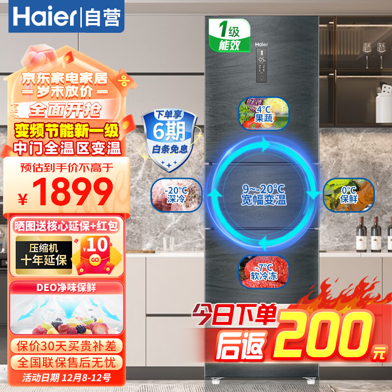海尔 (Haier)冰箱三门风冷无霜235升智能双变频一级能效干湿分储家用小型节能电冰箱价格:2099.00元!