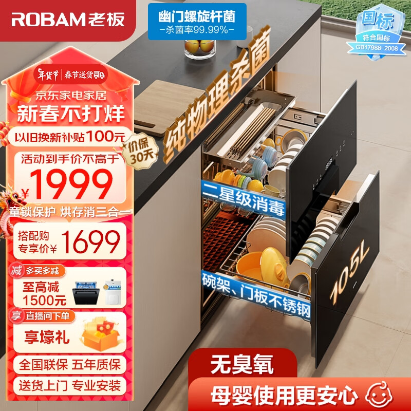老板(Robam)消毒柜家用 嵌入式 消毒碗柜 105L大容量双门三抽无臭氧二紫外线纯物理杀菌消毒柜XB710A价格:1999.00元!