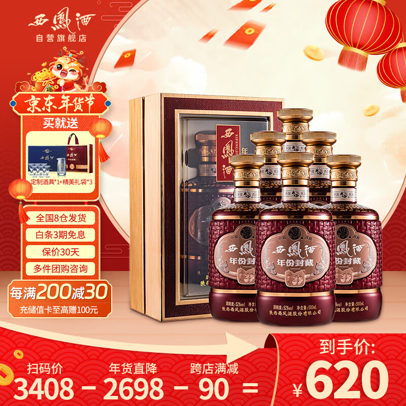 西凤酒 年份封藏52度陕西纯粮绵柔凤香型白酒婚宴年货送礼盒装500mL*6价格:710.00元!