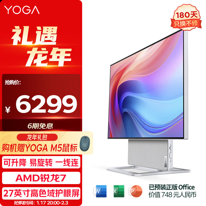 联想(Lenovo)YOGA 27 2023可旋转27英寸QHD屏一体台式电脑(R7-7840H 16G LPDDR5 1T SSD )银色价格:6299.00元!