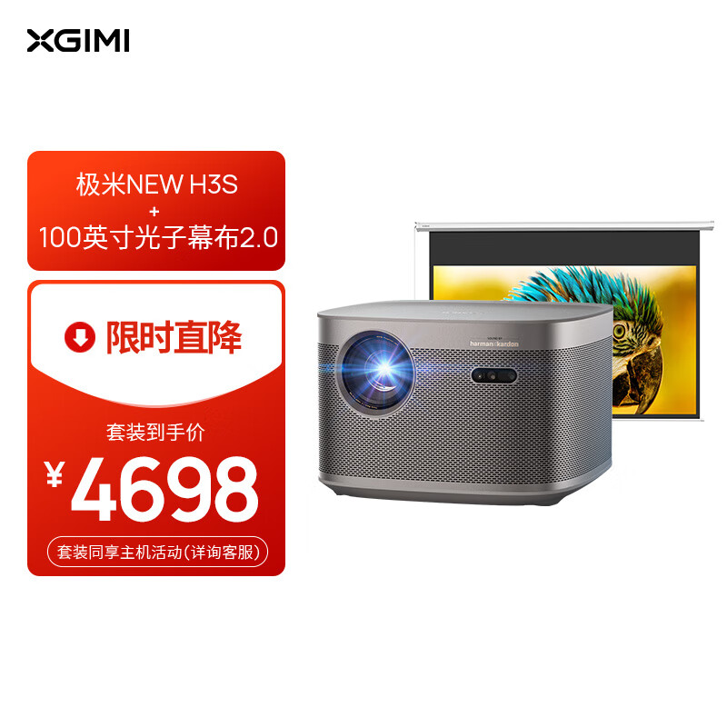 极米NEW H3S 套装6 投影仪家用+100英寸光子幕布2.0价格:4698.00元!