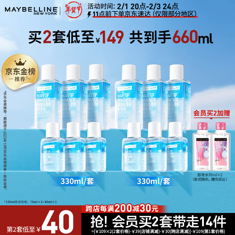美宝莲眼唇卸妆液套装330ml(70ml*3+40ml*3)全脸可卸深层清洁新年礼物价格:109.00元!