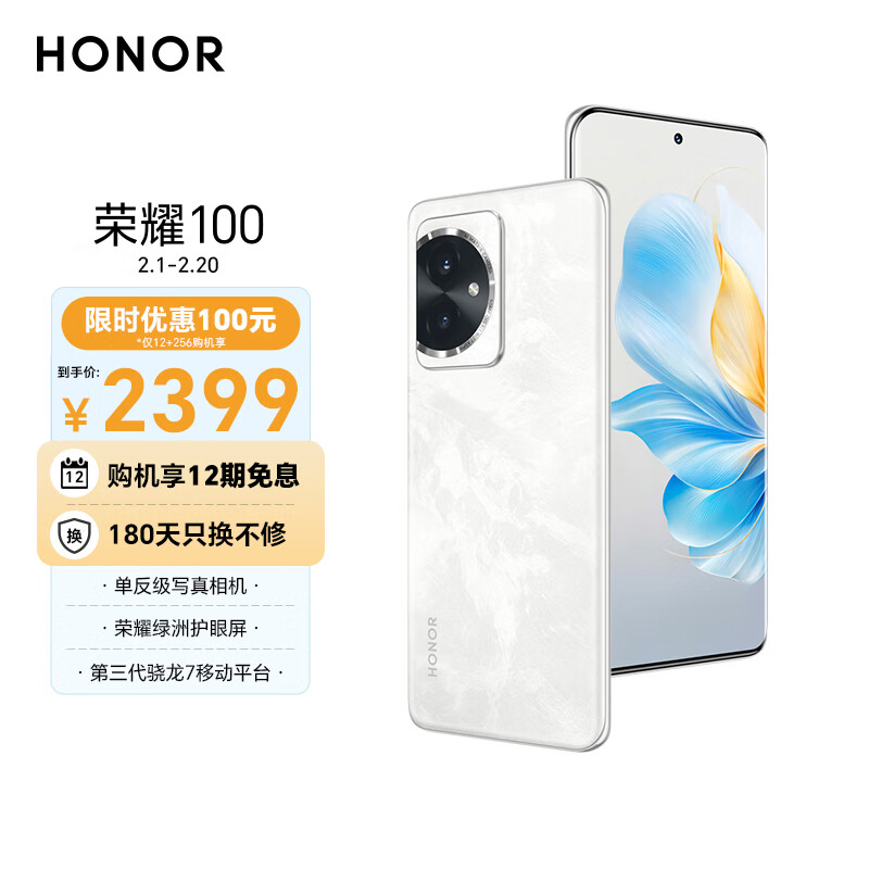 荣耀100 单反级主摄 荣耀绿洲护眼屏 第三代骁龙7移动平台 立体声双扬声器 OIS光学防抖 12+256 月影白 5G价格:2449.00元!