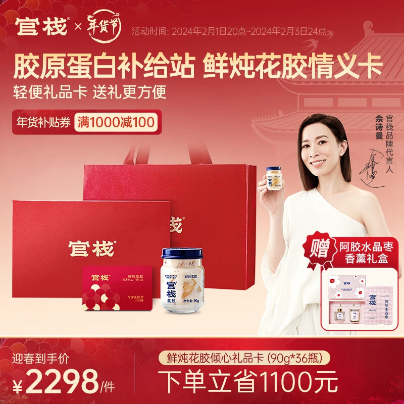 官栈【年货礼品卡】鲜炖花胶鱼胶礼品卡 尊享情意绵绵倾心卡(90g*36瓶)孕妇备孕术后滋补营养品送长辈爱人价格:3599.00元!