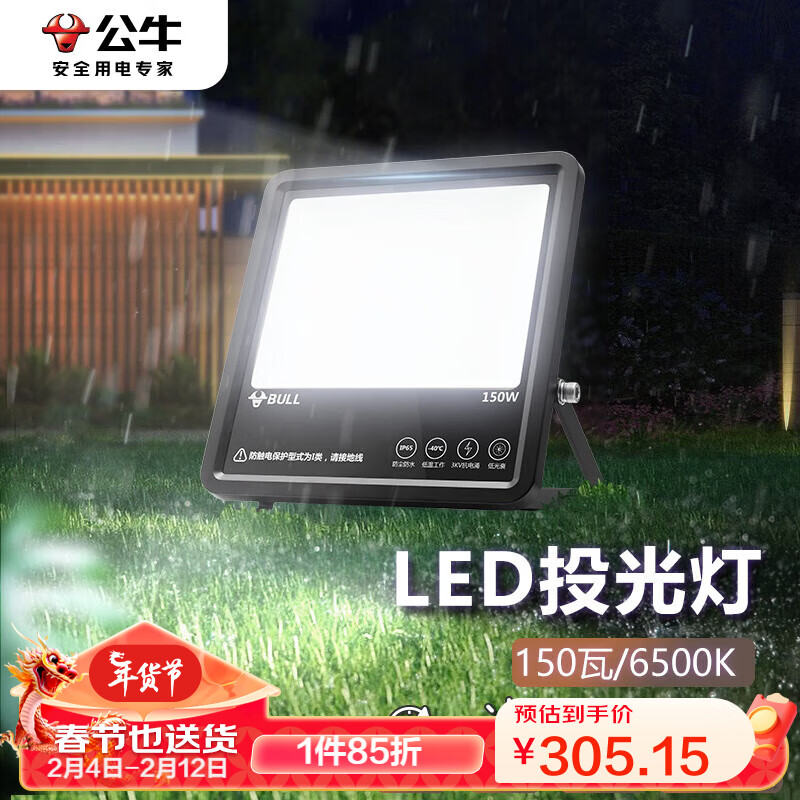 公牛(BULL)LED投光灯户外路灯庭院灯广告牌灯露营灯 IP65防水150W-6500K白光价格:359.00元!