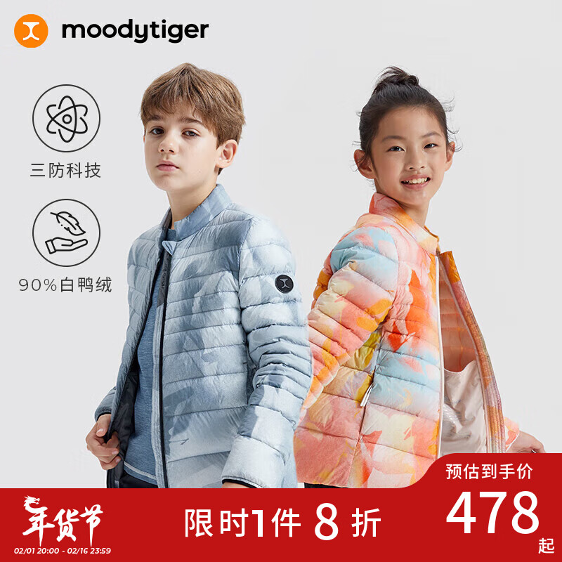 moodytiger儿童轻薄羽绒服23年秋冬季印花中性男女童三防保暖鸭绒服价格:598.00元!