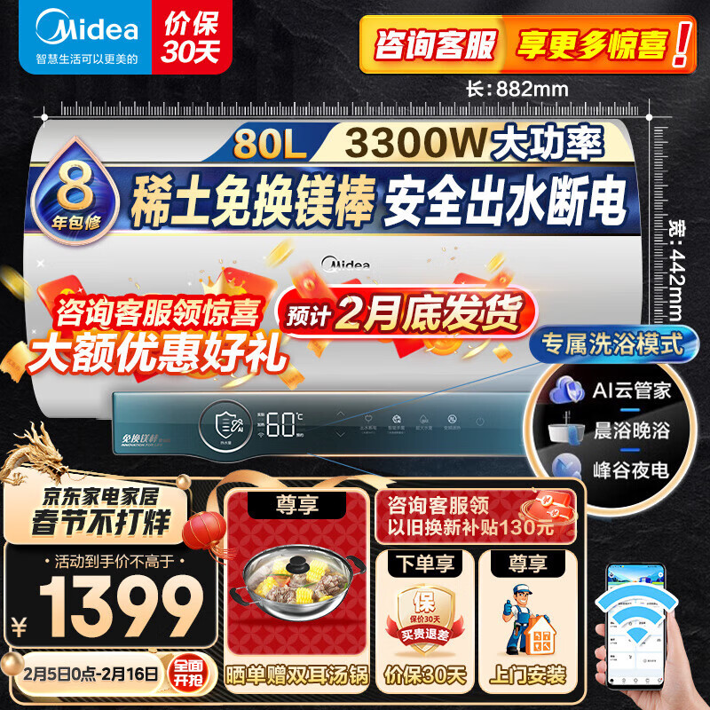美的(Midea)家用电热水器80升储水式 3300W变频 终身免换镁棒 零电洗一级节能 智能家电 F8032-JA5(HE)价格:1599.00元!