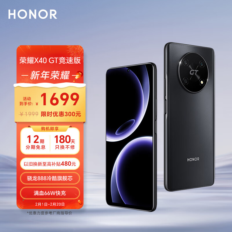 荣耀X40 GT竞速版 骁龙888冷酷旗舰芯 满血66W快充 超大内存 5G手机 12GB+512GB 幻夜黑价格:1999.00元!