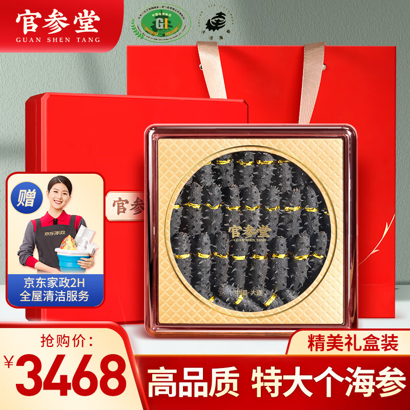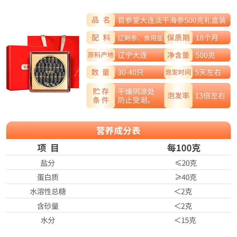 官参堂 大连淡干海参干货 丞甄500g 30-40只 辽刺参海鲜年货礼盒装价格:3468.00元!