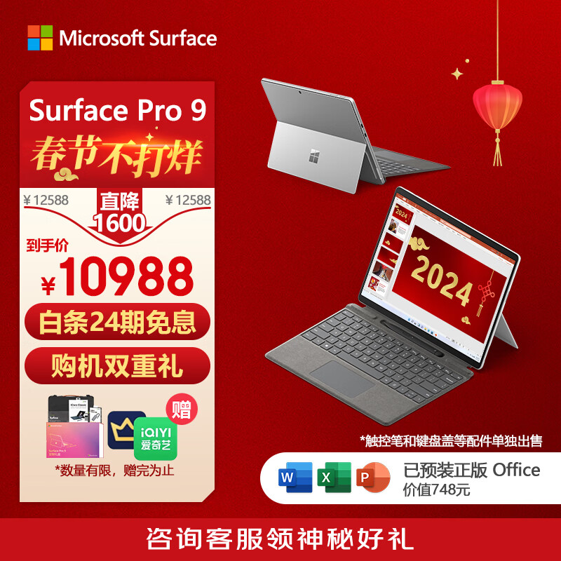 微软Surface Pro 9 二合一平板电脑i7/16G/256G 亮铂金 13英寸年货节高刷学生平板 办公轻薄笔记本电脑价格:10988.00元!