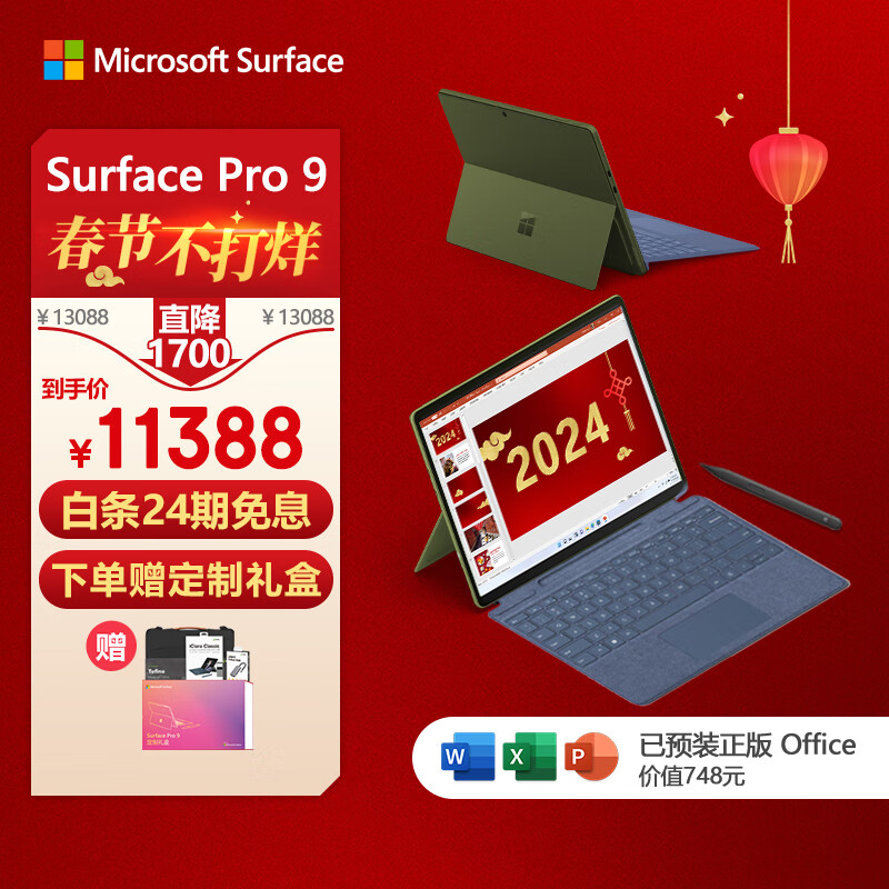微软Surface Pro 9 森野绿+宝石蓝带触控笔键盘盖 i5 16G+256G 二合一平板电脑 13英寸120Hz屏笔记本价格:11388.00元!