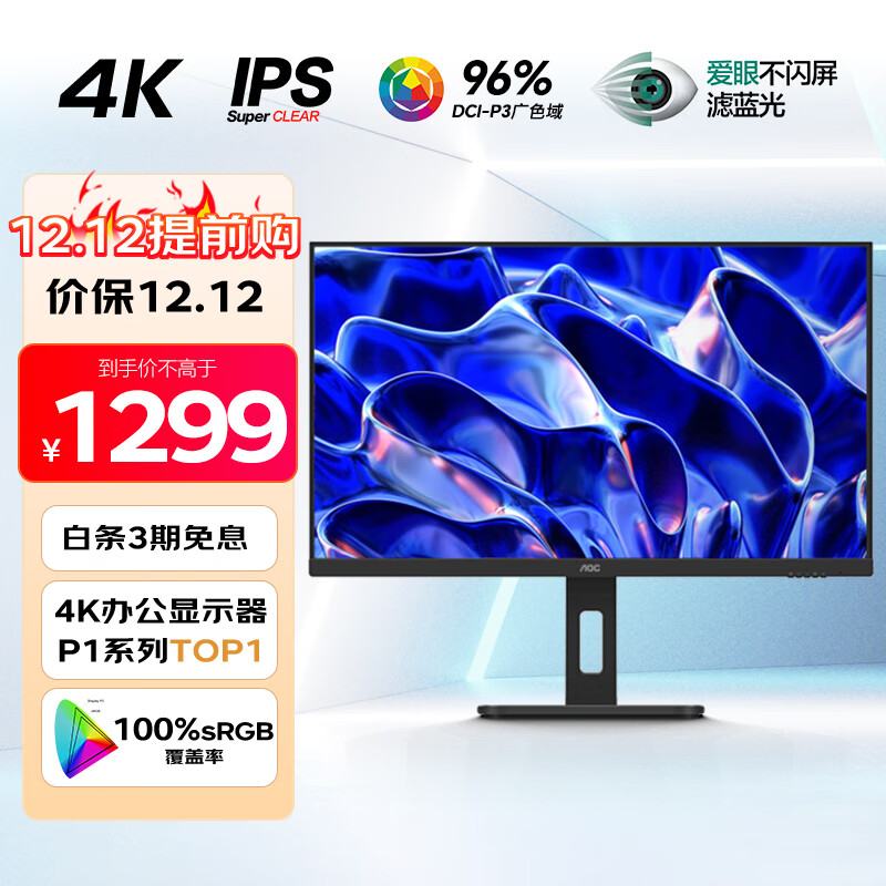 AOC电脑显示器 27英寸4K高清 IPS广视角 升降旋转 专业设计商用办公节能低蓝光爱眼不闪显示屏U27P10价格:1499.00元!