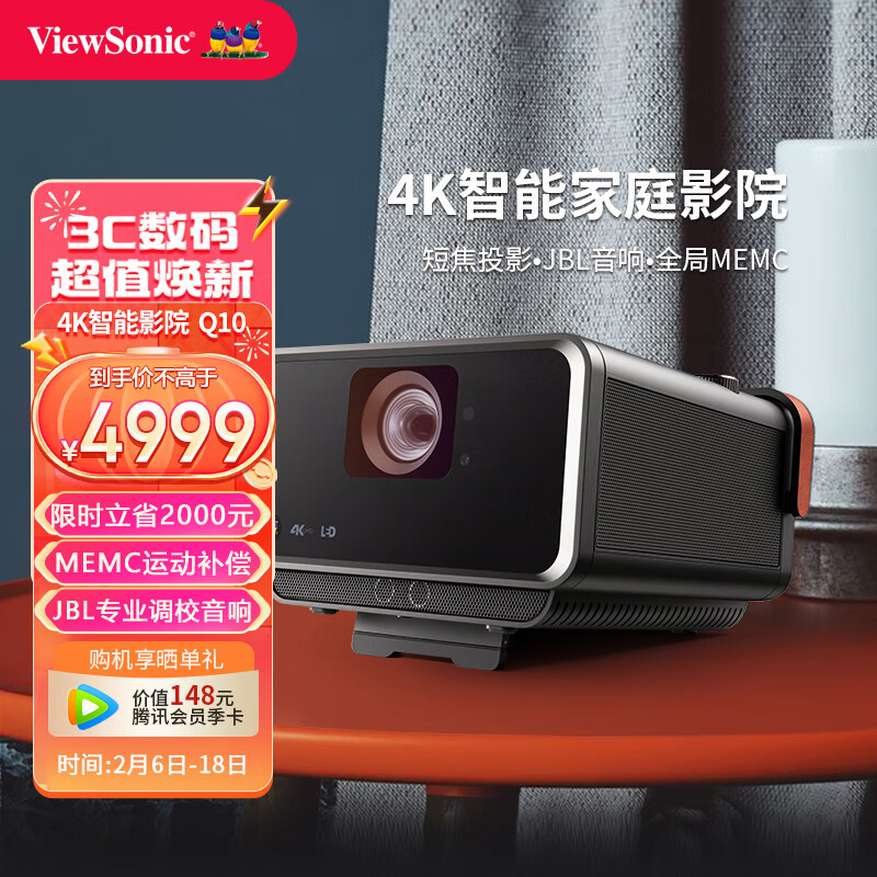 优派 Q10 投影仪家用 投影机 智能电视 手机投影(4K 运动补偿 HDR10 四向校正 智能缩放)价格:6999.00元!