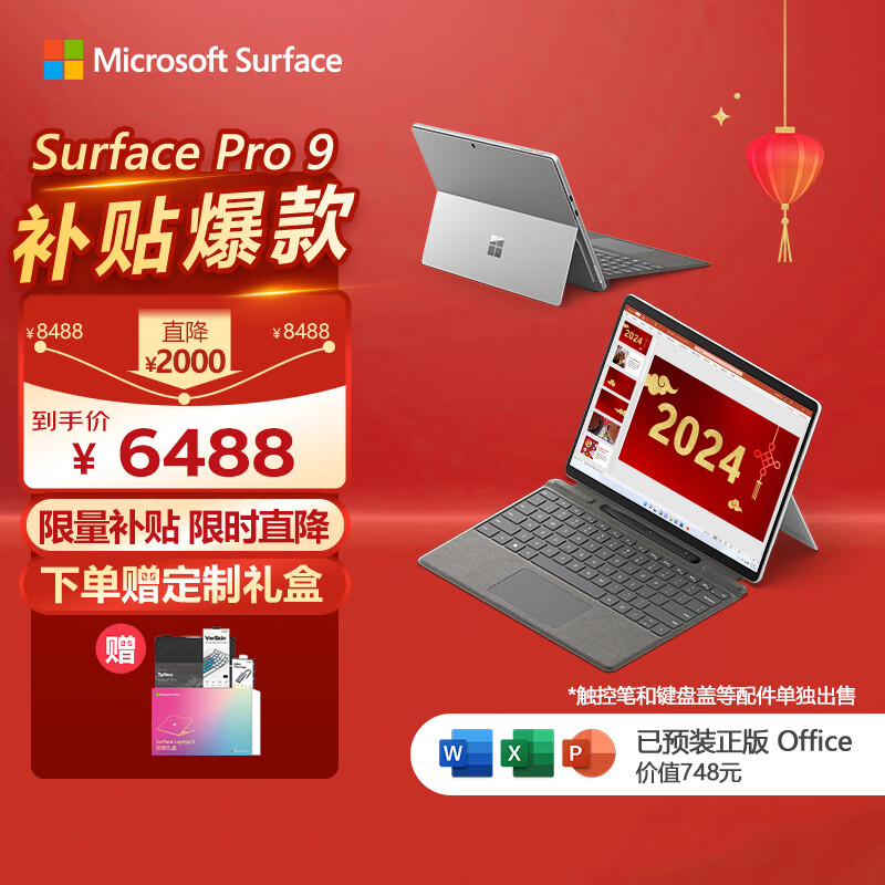 微软Surface Pro 9 二合一平板电脑i5/8G/256G亮铂金 13英寸高刷?年货节教育学习机高端办公笔记本电脑价格:6488.00元!